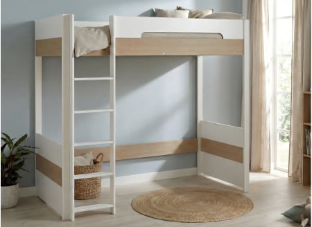 Die Struktur dieses Hochbetts ist aus massiver Kiefer mit einer lösungsmittelfreien weißen Wasserfarbe gefertigt. Dieses robuste Material sorgt für eine ausgezeichnete Stabilität und eine hohe Langlebigkeit über die Zeit. Das Innere des Betts ist aus Holzwerkstoffen mit niedrigem Formaldehydgehalt gefertigt, die für das Umfeld eines Kinderzimmers geeignet sind. Das FSC-zertifizierte Holz und die europäische Handwerksherstellung zeugen von einem Möbelstück, das mit Sorgfalt und Umweltrespekt gestaltet wurde. Das Ensemble bietet eine langlebige und zuverlässige Struktur für den täglichen Gebrauch.