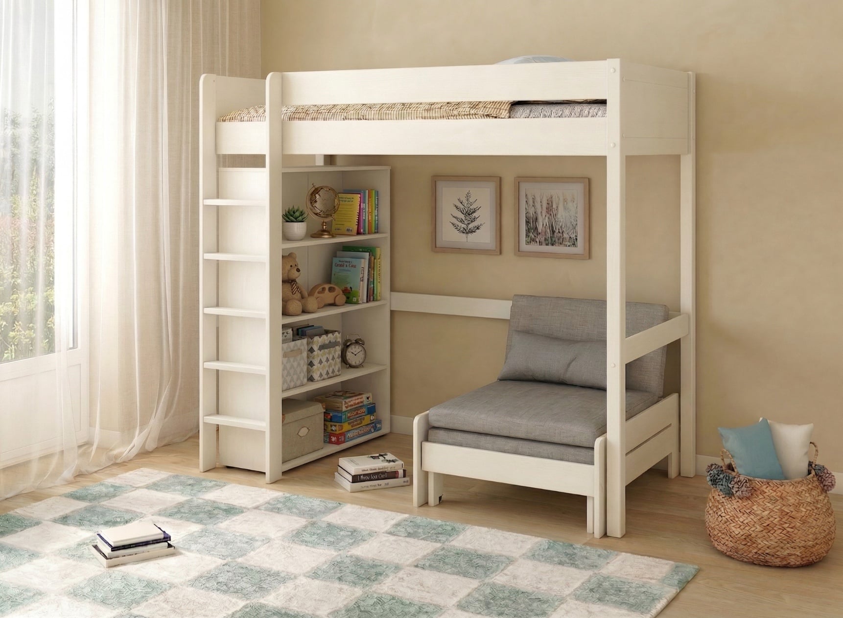 Dieses Hochbett mit Schlafsessel und Bücherregal ermöglicht es, ein Kinderzimmer praktisch und intelligent einzurichten. Dank des erhöhten Schlafplatzes kann der Platz unter dem Bett genutzt werden, um mit dem Schlafsessel eine komfortable Entspannungsecke zu schaffen. Das Kind verfügt somit über einen angenehmen Bereich zum Lesen, Ausruhen oder um einen Freund zu empfangen. Diese Konfiguration bietet eine vollständige und optimierte Einrichtung des Zimmers und bewahrt dabei einen komfortablen Bewegungsraum.