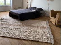 Vielseitig einsetzbar, findet dieser Ecru-Teppich leicht seinen Platz in mehreren Bereichen des Hauses. Im Wohnzimmer begrenzt er eine gemütliche Entspannungsecke; im Schlafzimmer bringt er beim Aufwachen Weichheit und Komfort; im Büro oder in einer Leseecke fügt er eine subtile dekorative Note hinzu. Er wird so zu einem dekorativen Accessoire, das ebenso praktisch wie elegant ist, um den Raum zu strukturieren.