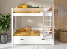 The wooden bunk bed HOYA with 3 beds is the sturdy and practical bunk bed you need. It is available in 3 colors - white, light gray, and khaki - to match all children's rooms, and its solid pine structure ensures stability and safety for your children. The third bed is a trundle bed that slides under the bottom bunk and doesn't take up space in the room.