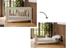 - An evolutive baby cot 70x140 cm: it starts as a secure crib for the first months, then transforms into a toddler bed with side rails, usable up to 6 years old (mattress not included).