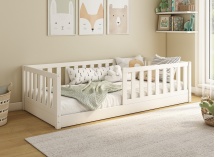 The structure of the Montessori bed in solid pine is made of robust natural wood, recognized for its sturdiness and durability. Solid pine brings a beautiful visual presence while ensuring excellent long-term resistance. The wood is FSC certified and finished with a water-based white paint free of solvents, environmentally friendly and suitable for a child's bedroom. The whole reflects a carefully crafted design using durable materials, ideal for everyday use.