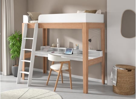 Este cama altillo con escritorio permite optimizar el espacio en una habitación ofreciendo a la vez un auténtico rincón de descanso y un cómodo espacio de trabajo. Con su cama elevada y su escritorio integrado, crea una distribución práctica y funcional adaptada tanto a niños como a adolescentes. El espacio situado bajo la cama puede albergar un sillón convertible, ideal para leer, relajarse o recibir a un amigo. El conjunto forma así un espacio completo para dormir, trabajar y relajarse en la habitación.
