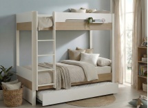 Ofrece 2 camas principales de 90x200, una tercera cama de 90x190 en somier extraíble de lamas, colores blanco y roble cálido que se mezclarán con todas las decoraciones de habitación y una fabricación francesa a partir de materiales ecológicos.