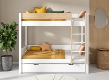 La litera de madera triple HOYA es la litera robusta y práctica que necesitas. Está disponible en 3 colores, blanco, gris claro y caqui, para adaptarse a todas las habitaciones infantiles y su estructura de pino macizo garantiza estabilidad y seguridad para tus hijos. La tercera cama es una cama nido que se desliza bajo la cama inferior y no ocupa espacio en la habitación.