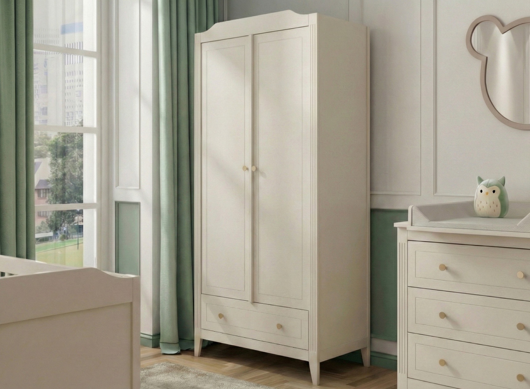 Con la sua silhouette equilibrata e le sue finiture lavorate, l'armadio bebè ÉLORIA rivela una vera attenzione ai dettagli: piedini smussati, scanalature verticali, frontali con effetto cornice realizzato tramite lavorazione di precisione… Le manopole in ottone sottolineano l'insieme e apportano un tocco raffinato supplementare.