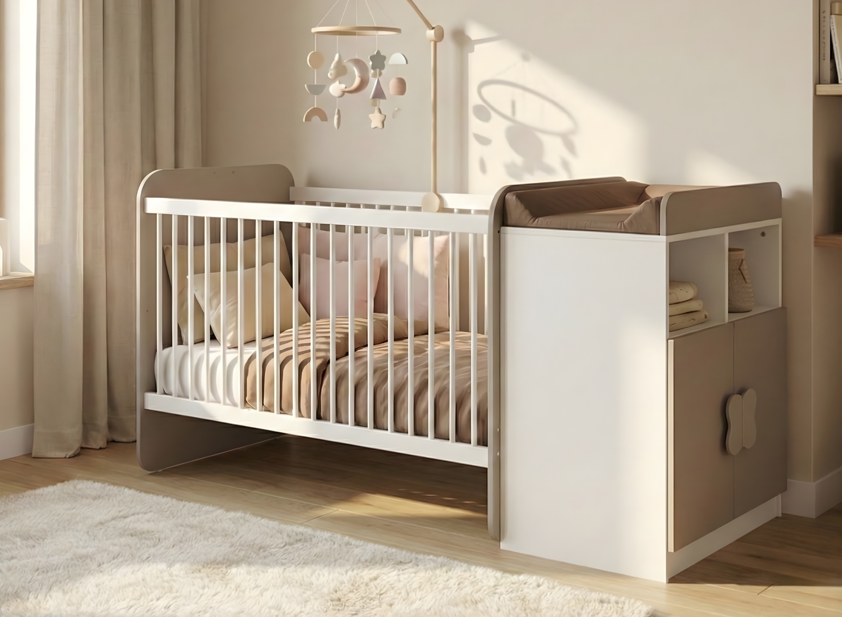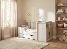 Per una maggiore praticità, questo letto include un fasciatoio funzionale, progettato per facilitare l'organizzazione delle cure quotidiane. I suoi spazi di archiviazione intelligenti permettono di tenere vestiti, pannolini e accessori sempre a portata di mano. Quando il bambino cresce, questo fasciatoio si trasforma in un comò elegante e spazioso, perfetto per organizzare i suoi effetti personali in modo ordinato e duraturo.