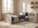 Quando il bambino diventa più indipendente, il letto si evolve in un letto intermedio 70x140 cm. È dotato di una barriera di sicurezza e di una sponda, che gli permettono di imparare a salire e scendere da solo, evitando le cadute. Questa configurazione intermedia rassicura i genitori e offre al bambino uno spazio confortevole adatto al suo sviluppo.