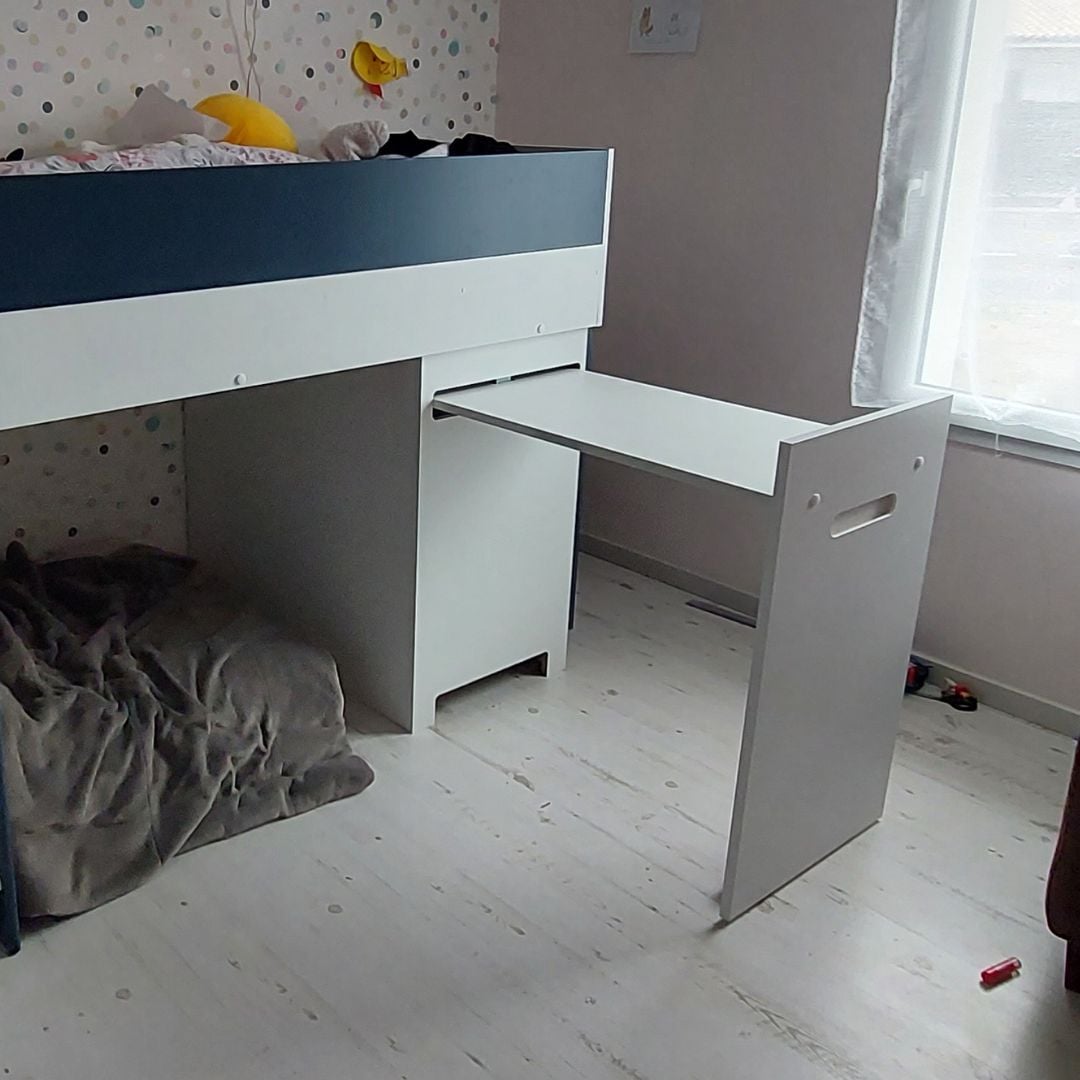 Progettato per adattarsi a tutte le configurazioni della camera, il letto MANLY può essere montato con la scrivania e la cassettiera a destra o a sinistra secondo le vostre esigenze. È compatibile con un materasso 90x190 cm con un'altezza massima di 13-16 cm (non incluso). Da notare che questo tipo di letto rialzato è sconsigliato ai bambini di età inferiore ai 6 anni.