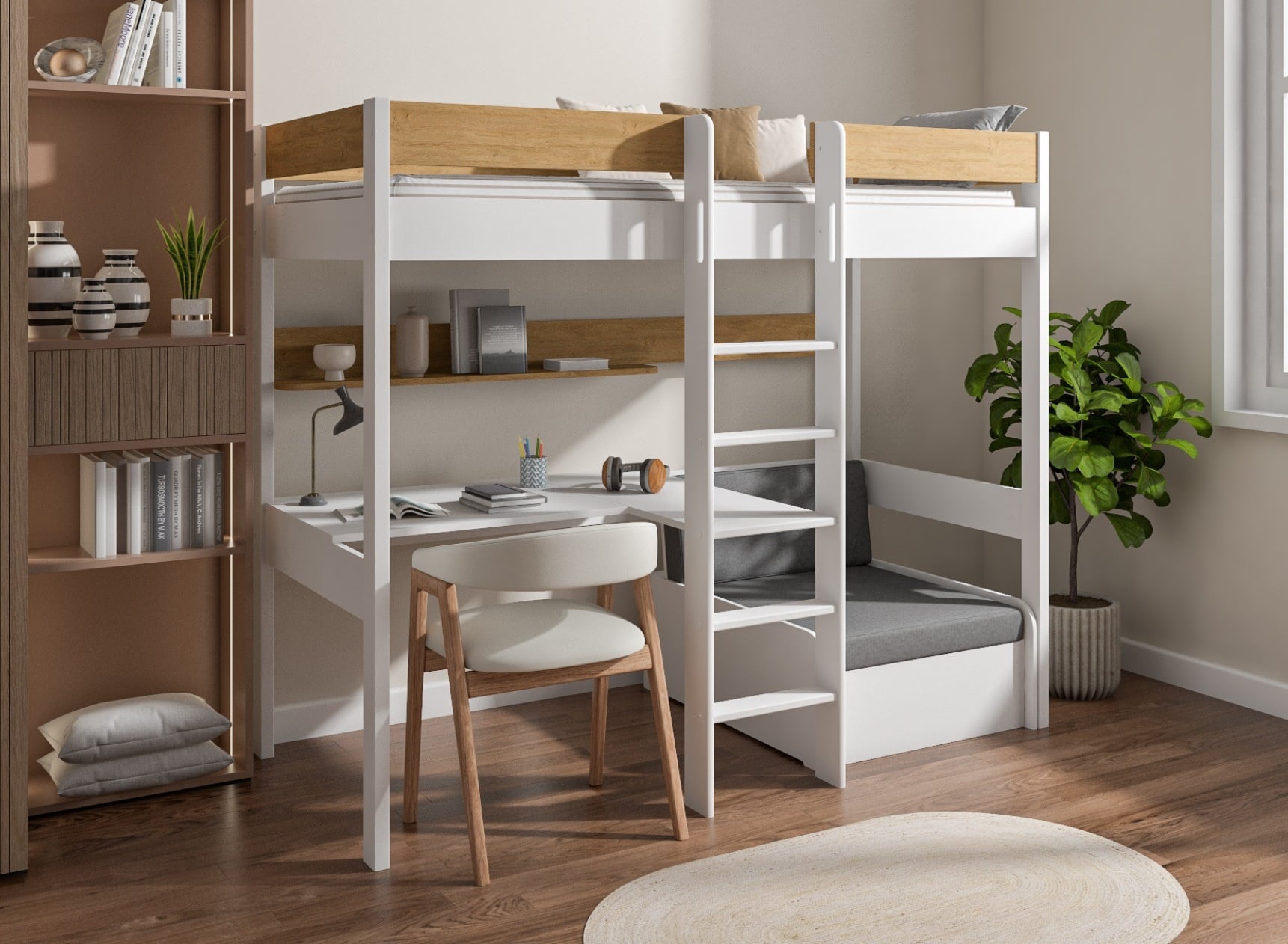 Letto a soppalco 90x200 con scrivania e poltrona EDGAR - Bianco/Rovere