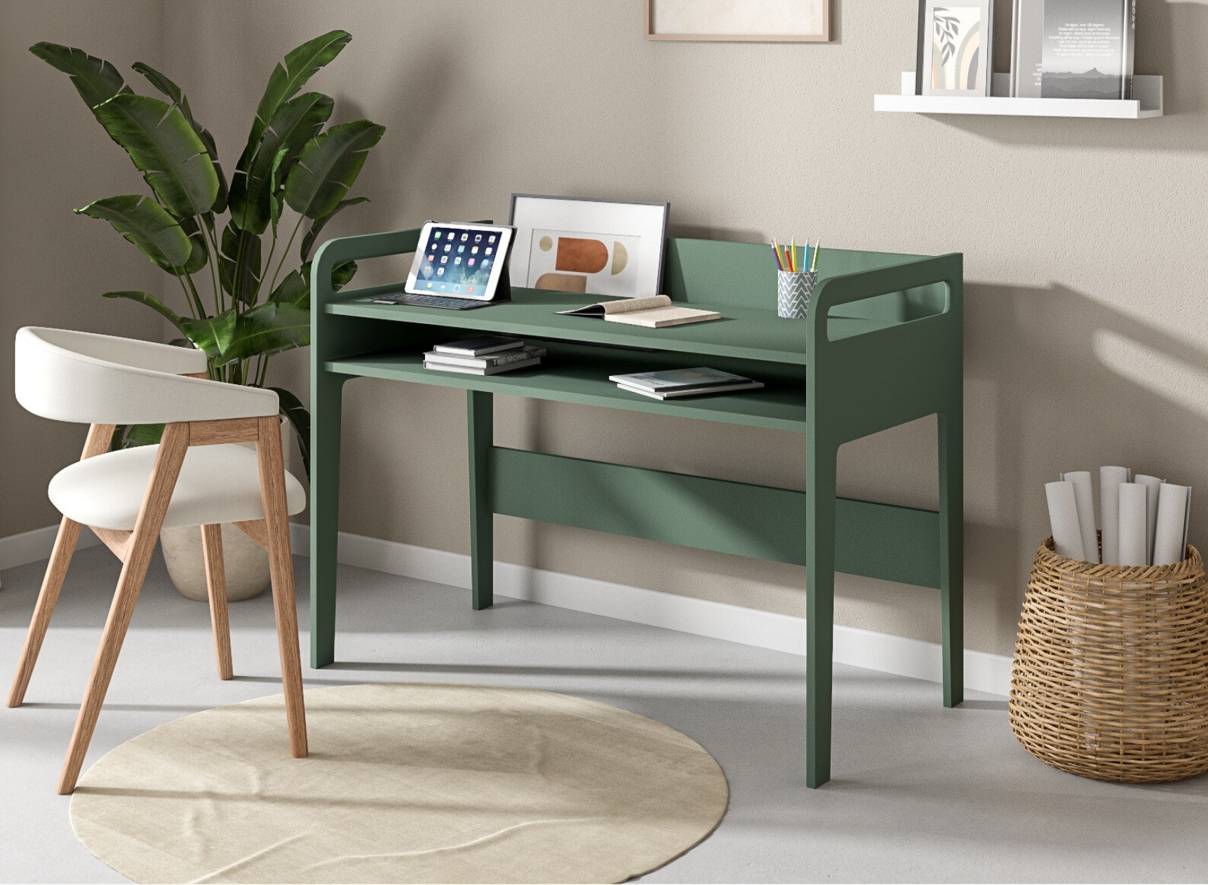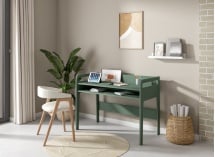 Con la sua tonalità kaki sottile e attuale, la Scrivania con vano ARLES – Kaki conferisce una vera identità a uno spazio di lavoro per adulti. Pensata sia per il lavoro da remoto che per uso professionale, trova facilmente il suo posto in interni moderni, naturali o essenziali. Il suo design equilibrato associa linee sobrie e funzionalità, per creare un ambiente favorevole alla concentrazione senza trascurare l'estetica.