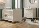 Deze babykamer duo is vervaardigd uit massief beukenhout voor de poten, lijstwerk en elementen van het bed, evenals uit PEFC-gecertificeerde houten panelen afkomstig uit een verantwoorde sector. De crèmekleurige afwerking is gerealiseerd met een watergedragen verf zonder oplosmiddel of VOS, wat bijdraagt aan het behoud van de binnenluchtkwaliteit. De messing knoppen van de commode brengen een elegante toets aan dit geheel dat ontworpen is om lang mee te gaan.