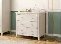 De ÉLORIA commode vult het geheel perfect aan met zijn drie ruime laden uitgerust met een soft-close systeem voor een zachte en stille sluiting. Zijn verzorgde design, afgeschuinde poten, cannelures, doucines en gevels met kadereffect, geven hem een klassieke en elegante stijl. Zijn blad gepositioneerd op 90 cm hoogte maakt het mogelijk om een compatibel aankleedkussen (apart verkocht) toe te voegen om een functionele verschoonruimte te creëren.