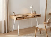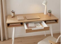 Net als andere meubels ontworpen door Nateo Concept, respecteert dit bureau met lade onze ecologische waarden. Het is gemaakt van ecologische houtpanelen met een laag formaldehydegehalte, houtpanelen met eikenfineer, PEFC-gecertificeerde massief beuken poten en witte watergedragen verf voor de poten. Zo respecteert het zowel het gezin als het milieu.