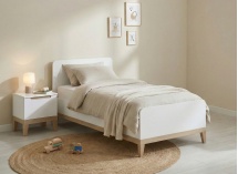Deze kinderkamer heeft een bed van 90x200 cm met een geïntegreerd hoofdeinde en poten van massief beukenhout, voor een combinatie van zachtheid en natuurlijkheid. Vergeet niet om een comfortabele lattenbodem en matras van 90x200 te kiezen om dit bed compleet te maken.