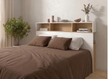 Het PRADO hoofdeinde 140 met verhoging is ideaal voor wie op zoek is naar zowel een elegant meubel als een slimme opbergoplossing. Het helpt de slaapkamer opgeruimd te houden terwijl dagelijkse voorwerpen binnen handbereik blijven. Aan de zijkanten bieden twee compartimenten, slim verborgen achter sobere deuren, een discrete en gestructureerde opbergruimte. Elk is uitgerust met 48 cm diepe planken, perfect voor het opbergen van boeken, nachtaccessoires, beddengoed of zelfs kleine elektronische apparaten.