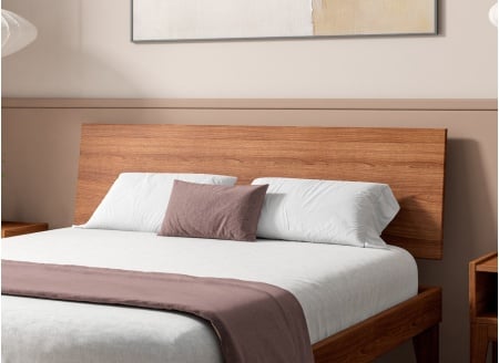 Het hoofdeinde wordt verfraaid door een natuurlijke vernis in notenhoutkleur, zonder toxische uitstoot, die het hout beschermt terwijl het de unieke nerf benadrukt. Deze matte en verzorgde afwerking geeft het geheel een natuurlijke elegantie en een mooie diepte van kleur, perfect in overeenstemming met duurzame en tijdloze decoratietrends.