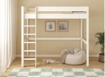 De structuur van deze hoogslaper is vervaardigd uit massief grenenhout met een watergedragen witte verf zonder oplosmiddelen. Dit robuuste materiaal zorgt voor uitstekende stabiliteit en grote duurzaamheid op lange termijn. Het binnenwerk van het bed is gemaakt van samengestelde houten panelen met een laag formaldehydegehalte, geschikt voor de omgeving van een kinderkamer. Het FSC-gecertificeerde hout en de Europese ambachtelijke fabricage getuigen van een zorgvuldig en milieuvriendelijk ontworpen meubelstuk. Het geheel biedt een duurzame en betrouwbare structuur voor dagelijks gebruik.