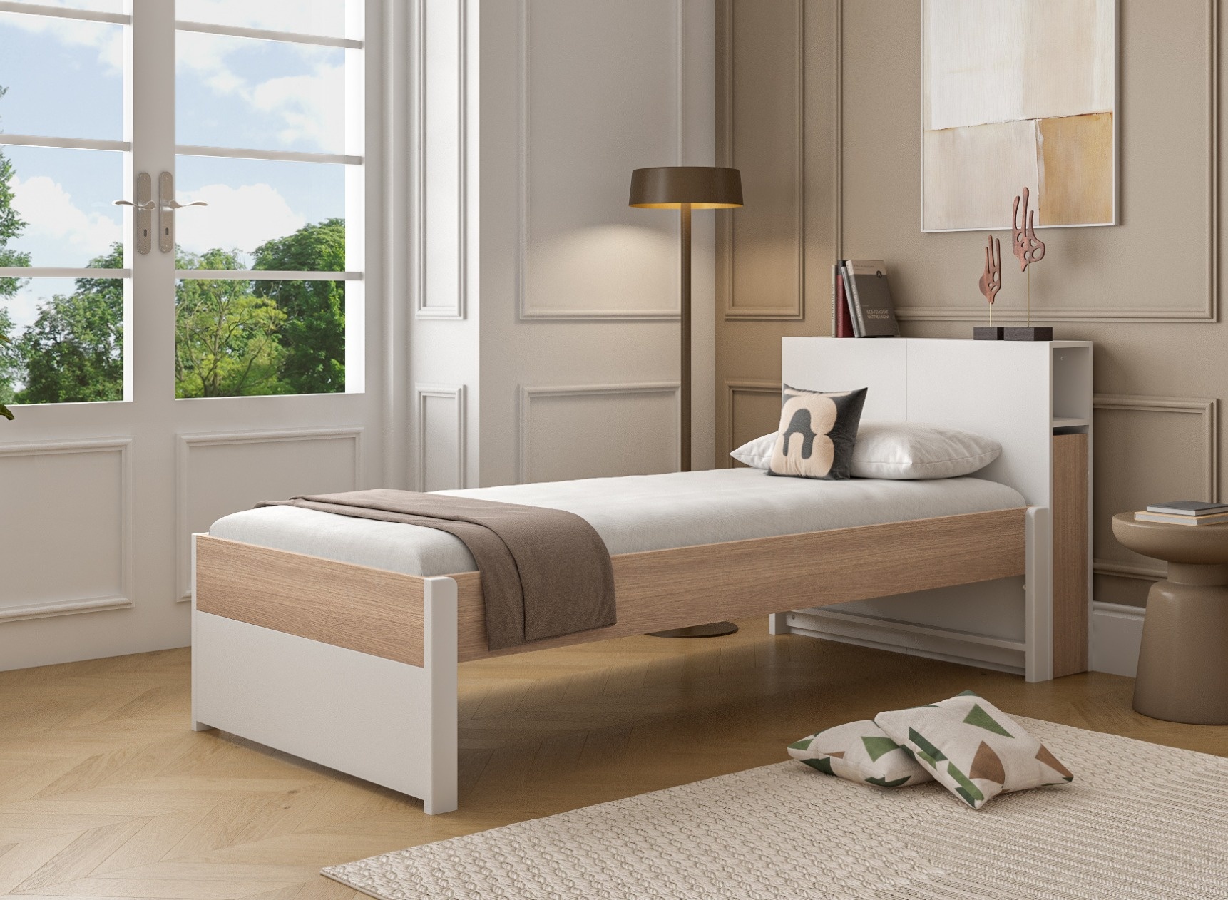 Als u op zoek bent naar een kinderhoofdboard dat in alle kamers past, kunt u kiezen voor het 90x200 hoofdeinde PRADO! Het eenvoudige en strakke Scandinavische design past bij alle decoraties. De lichte kleuren van het hoofdeinde (licht hout en wit) passen perfect bij de kleuren van de kinderkamer.