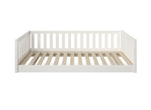 De structuur van dit Montessori bed in massief grenen is volledig vervaardigd uit robuust natuurlijk hout, bekend om zijn stevigheid en duurzaamheid. Het hout is FSC-gecertificeerd, wat een verantwoord bosbeheer garandeert. De witte afwerking is verkregen dankzij een watergedragen verf zonder oplosmiddelen, perfect aangepast aan een kindomgeving. Deze materiaalkeuze benadrukt gezond en duurzaam meubilair voor de kinderkamer, ontworpen om bestand te zijn tegen dagelijks gebruik.