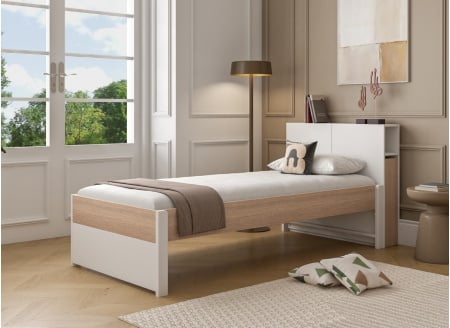 Ons bed met opbergruimte OLYMPE is zowel stijlvol als praktisch met zijn strakke lijnen en drie opbergmogelijkheden. De witte en houten kleur brengt zachtheid in de kamer van uw kind en is tegelijkertijd tijdloos. Uw kind/tiener zal er niet op uitgekeken raken en kan het jarenlang gebruiken.
