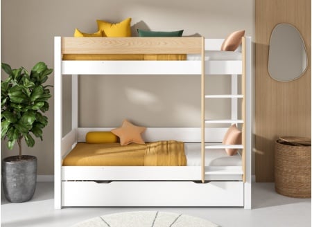 Het stapelbed van massief grenenhout HOYA is ontworpen zodat uw kinderen een veilige en esthetische slaapplaats hebben die zich aanpast aan alle kinder- of tienerkamers en aan het dagelijks leven van uw gezin. Dankzij de twee slaapplaatsen kunnen uw kinderen in dezelfde kamer slapen zonder vloerruimte te verliezen. U kunt zelfs een bedlade of een uitschuifbed toevoegen om een stapelbed met 3 slaapplaatsen te hebben.