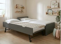 Dankzij de uitschuiflade onder het hoofdbed, verandert dit bed in een oogwenk in een tweepersoonsbed. De lade is geschikt voor een matras van 90x190 cm met een dikte van 13 tot 16 cm, afhankelijk van het gewenste comfort. Eenmaal gesloten keert het bed terug naar zijn compacte en discrete formaat, ideaal voor kleine ruimtes of logeerkamers.