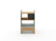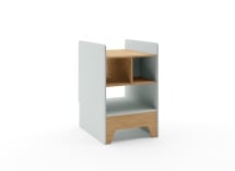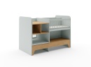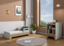 Met zijn afgeronde lijnen en trendy combinatie van saliegroen en eikenhout, past het BROOM bed perfect in een kamer met een zachte en natuurlijke stijl. De geïntegreerde opbergruimte zorgt ervoor dat luiers, kleding of speelgoed binnen handbereik zijn, terwijl de vloerruimte beperkt blijft.
