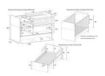 Vanaf de geboorte zorgt de wiegmodus met 40x80 cm matras (meegeleverd) en lattenbodem verstelbaar in 3 hoogtes voor comfort en veiligheid. Naarmate het kind groeit, verandert het bed in een babybed van 70x140 cm (matras niet inbegrepen, maximale dikte 12 cm), en vervolgens in een kinderbed dankzij de meegeleverde transformatieset. Geen behoefte om bij elke fase een nieuw bed te kopen: een duurzame en economische oplossing.